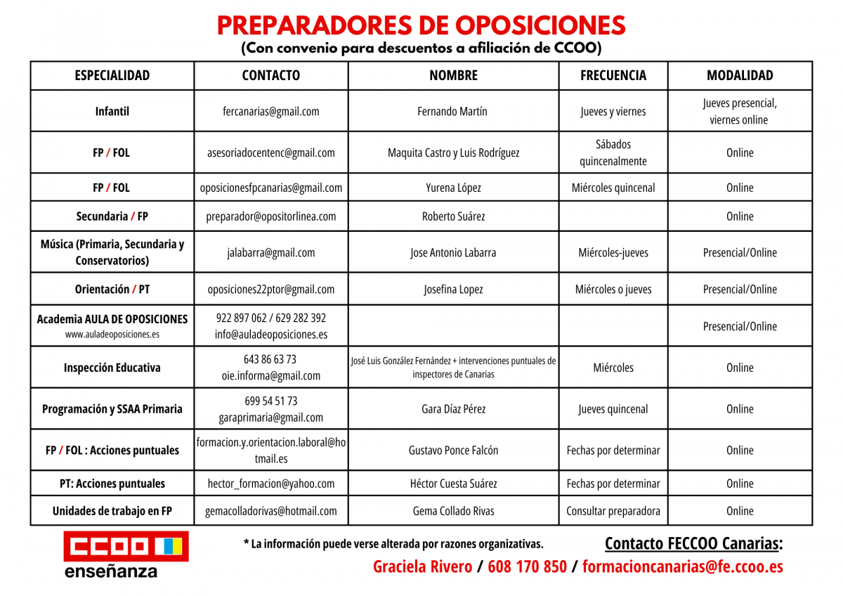 Preparadoras/es oposiciones 2025 con convenio con FECCOO Canarias